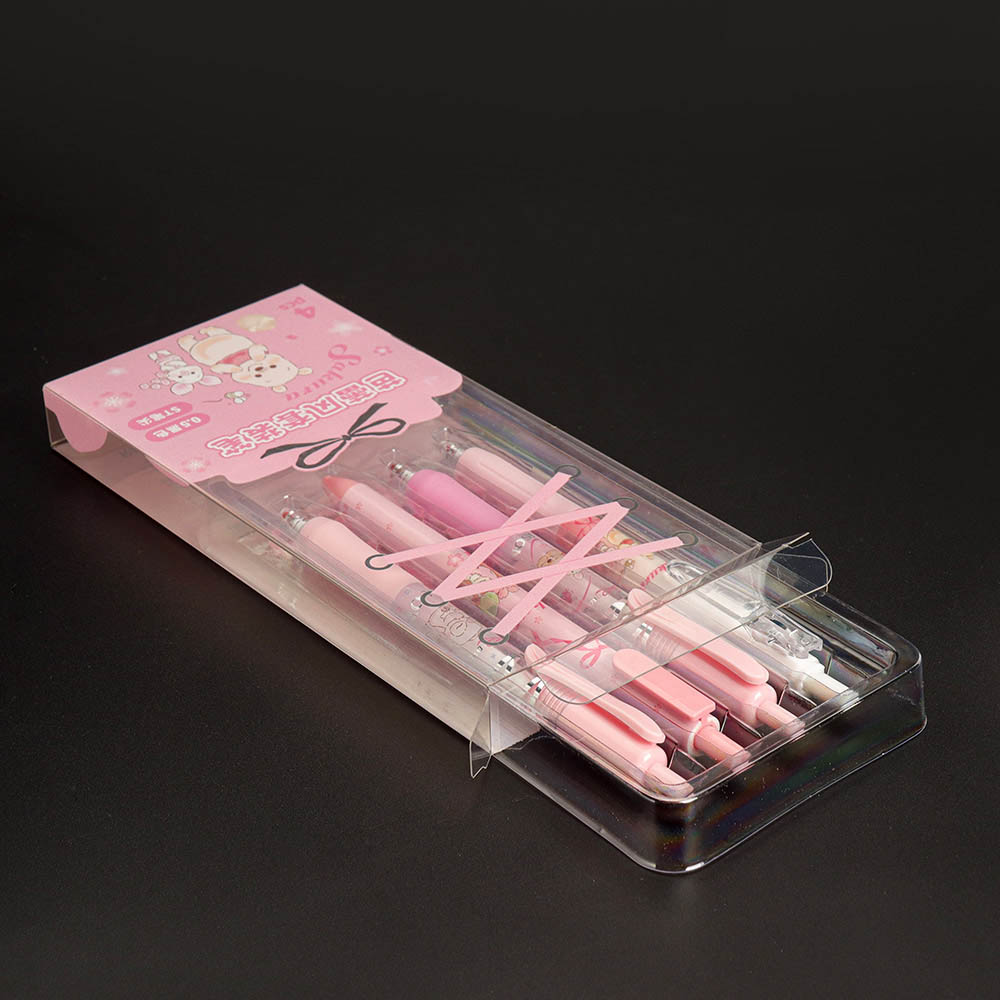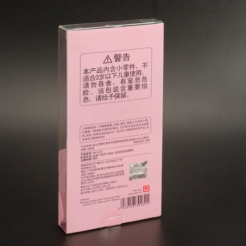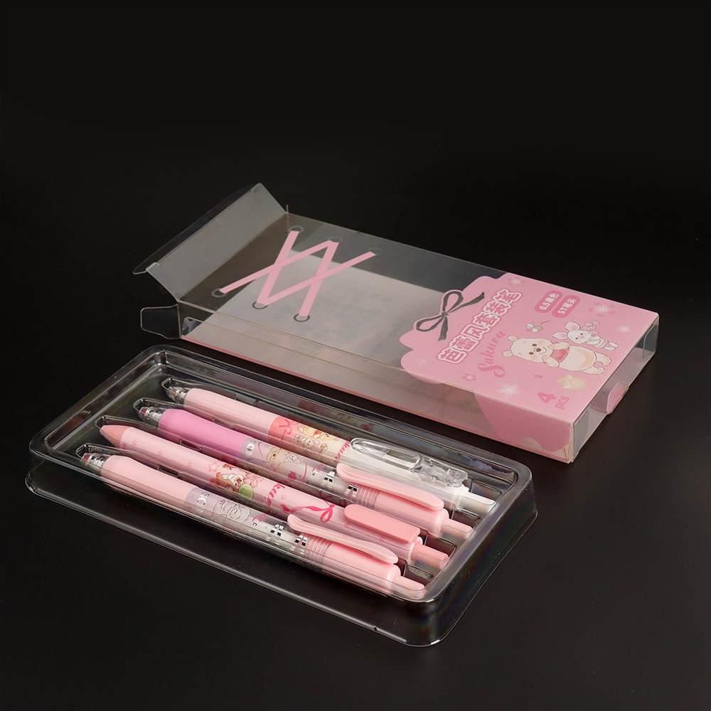 El embalaje de plástico está fabricado con PET de grado alimentario altamente translúcido, creando una caja cristalina que permite apreciar el diseño del bolígrafo sin necesidad de abrirla. La bandeja blíster se puede personalizar según el diámetro y la longitud del producto. La caja de plástico transparente admite diversas técnicas de impresión, como estampado en caliente, degradados y relieves 3D. Se pueden incorporar elementos de la marca tanto en la superficie de la caja como en el interior.