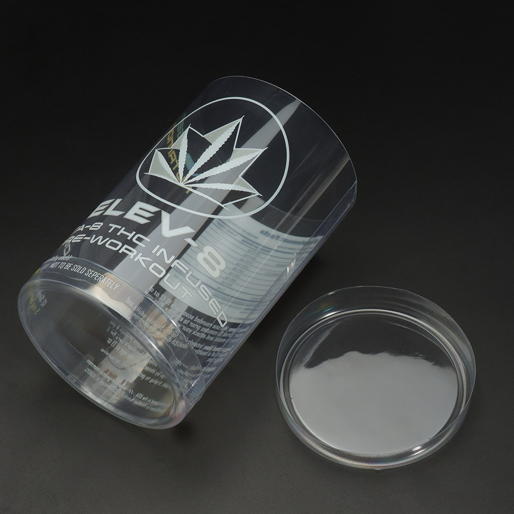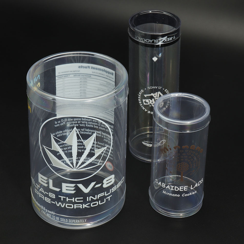 Tubo cilíndrico redondo de plástico transparente con impresión personalizada. Tubos de embalaje de plástico.